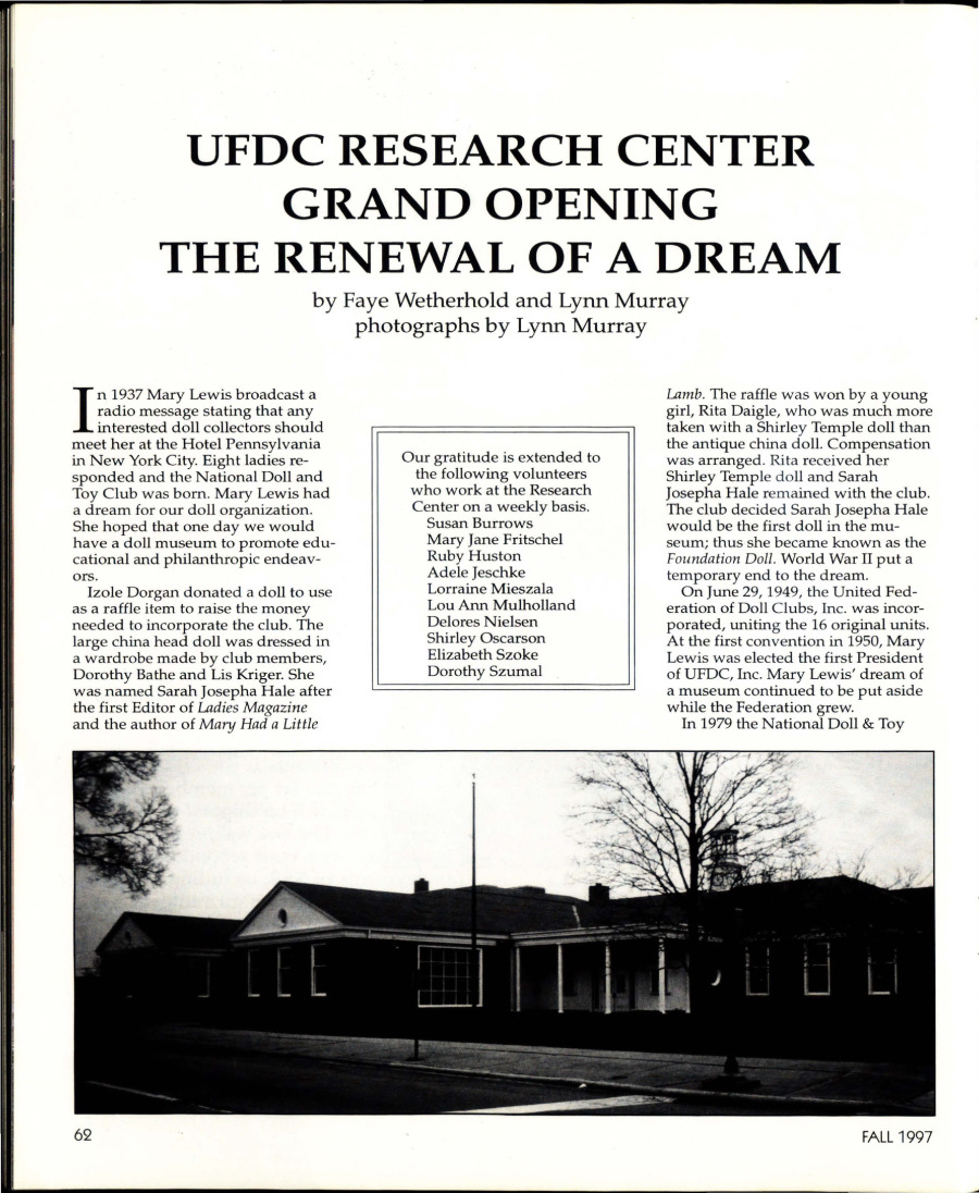 The United Federation of Doll Clubs (UFDC) is a non-profit organization with the goal of being the foremost in research, education, conservation, collecting, and appreciation of dolls.