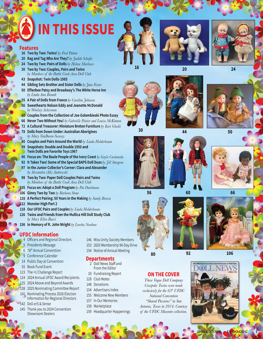 The United Federation of Doll Clubs (UFDC) is a non-profit organization with the goal of being the foremost in research, education, conservation, collecting, and appreciation of dolls.