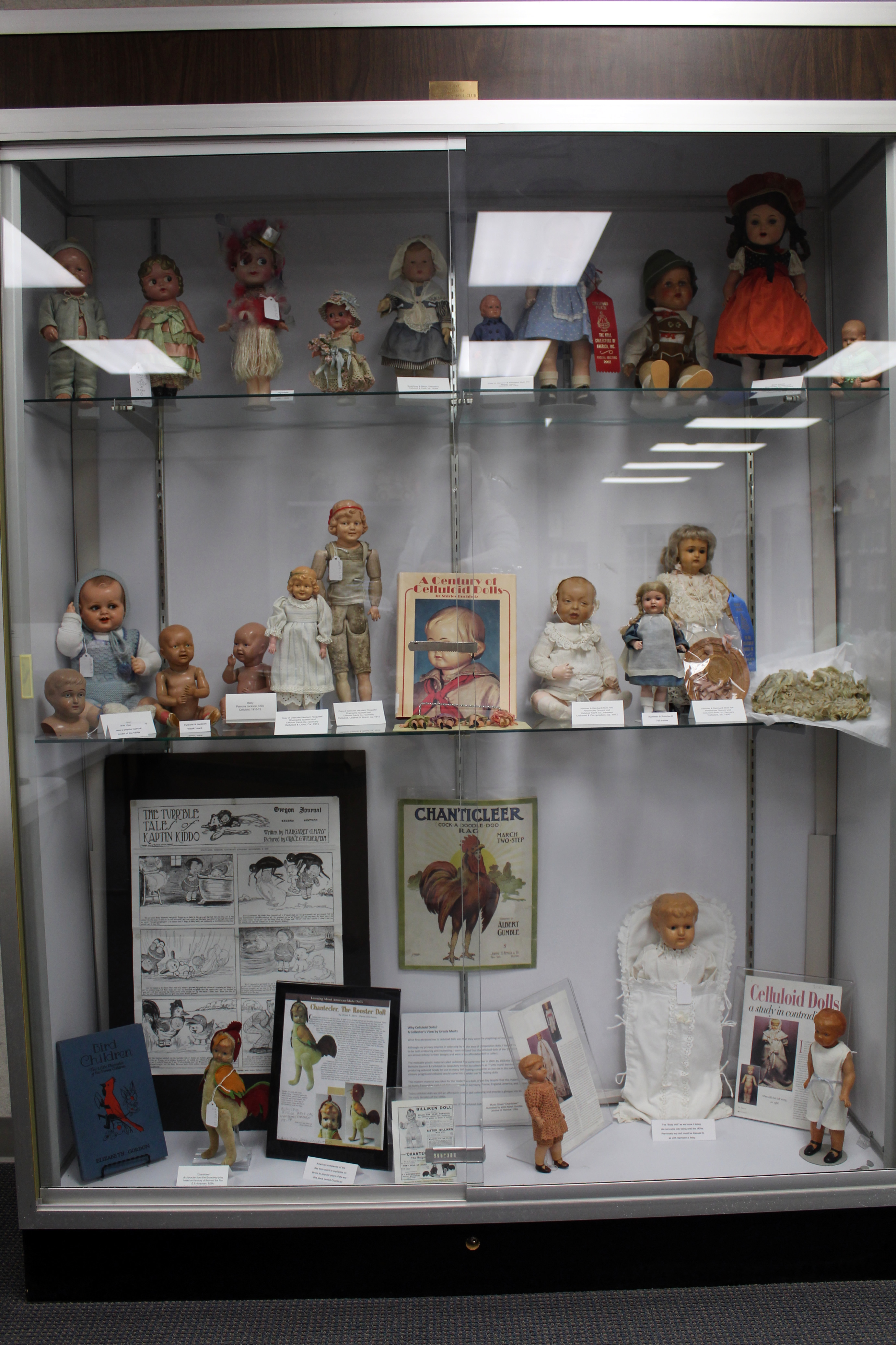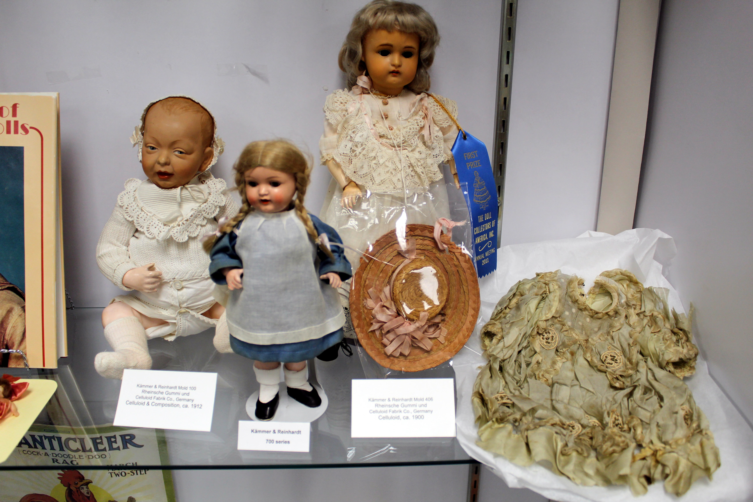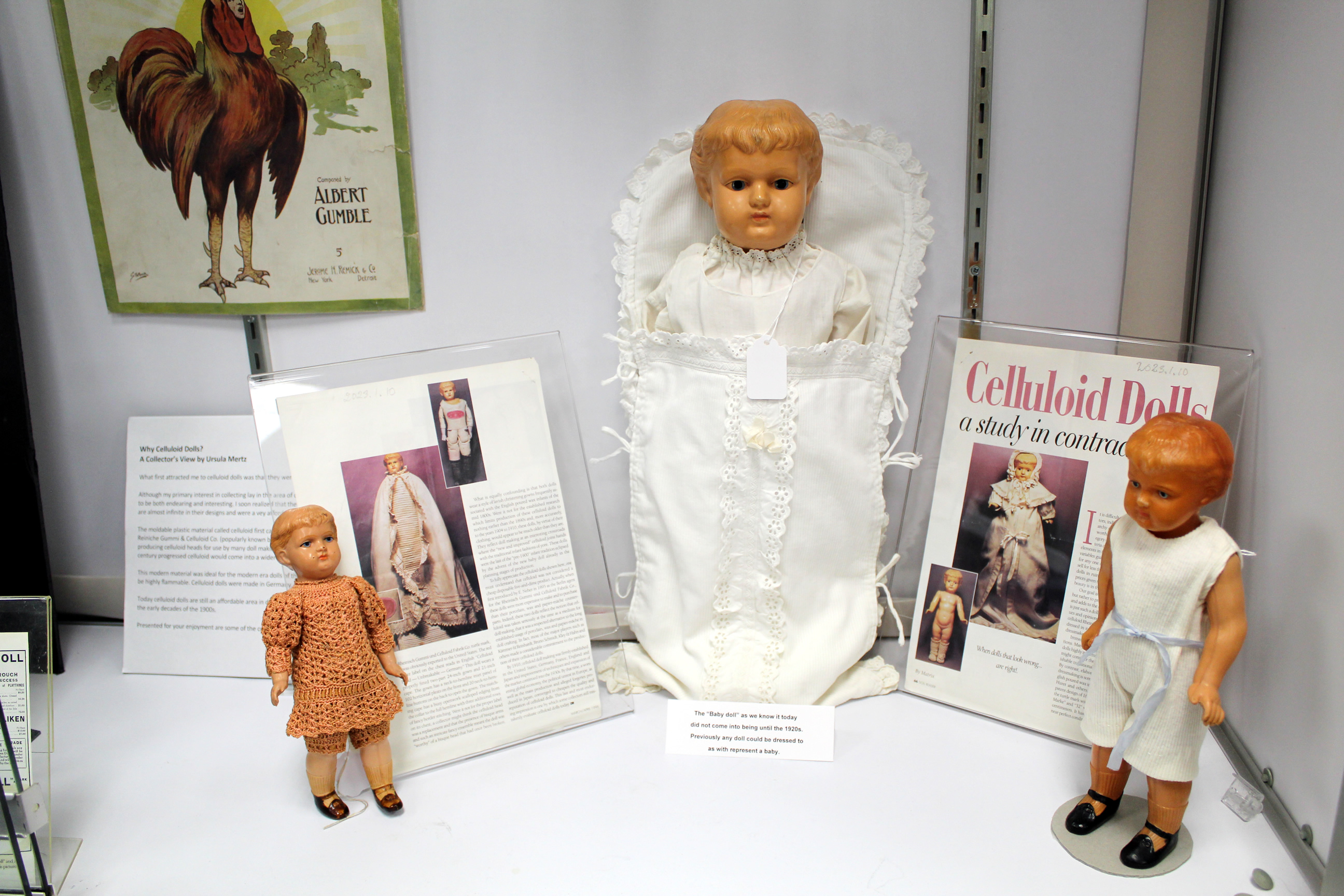 Shirley is the author of a book on celluloid dolls, which is shown in the exhibit, as well as several of the celluloid dolls which are featured in the book.