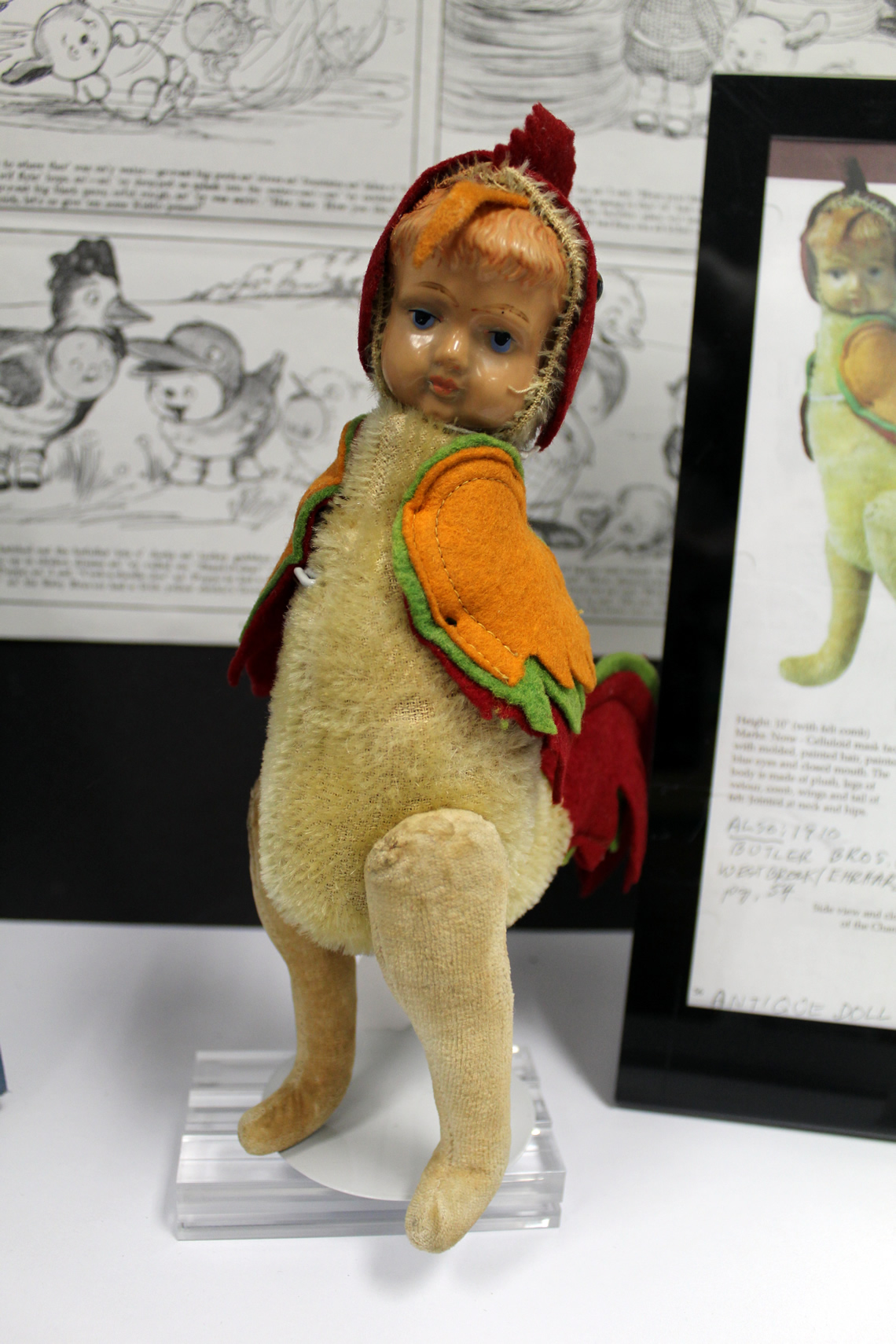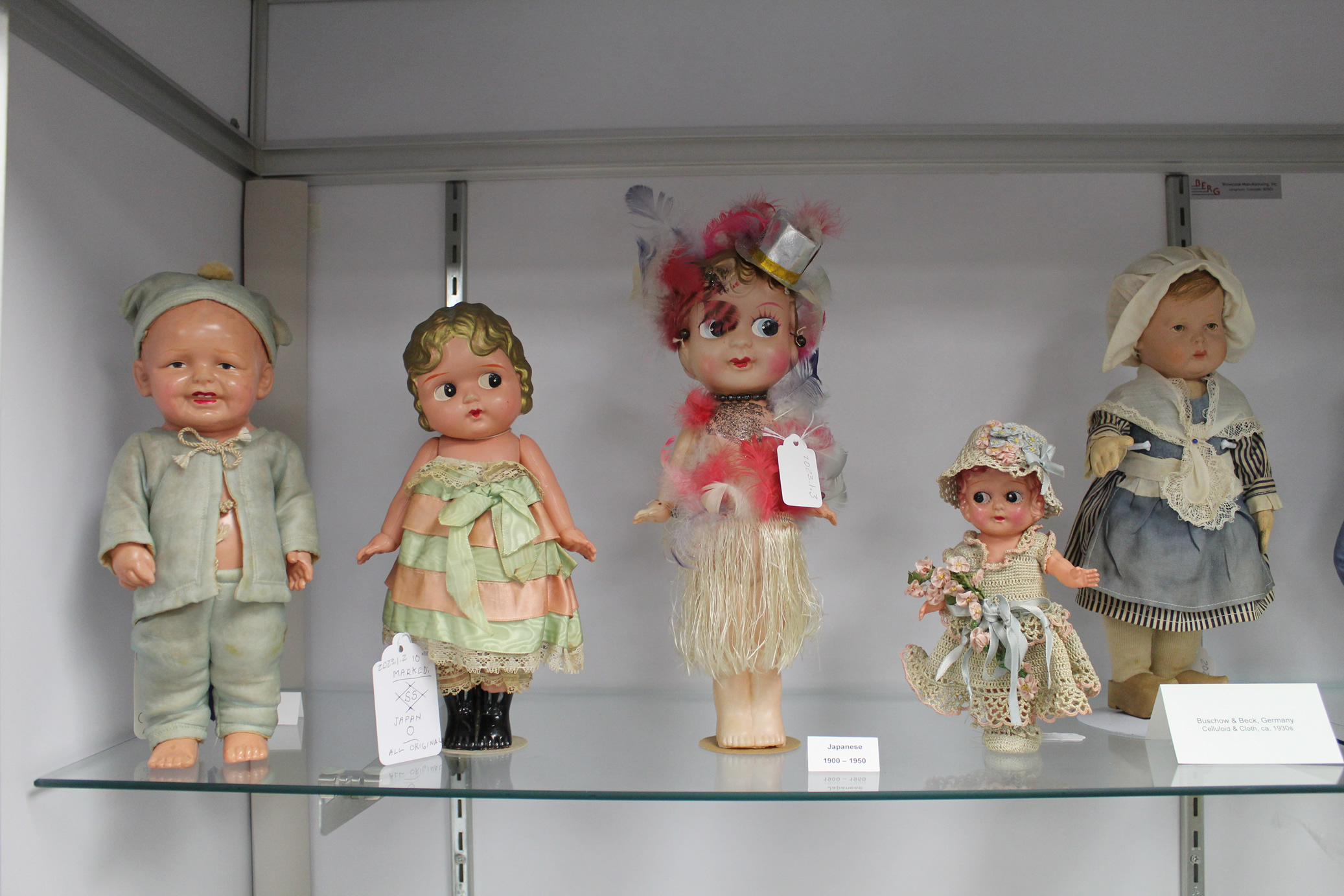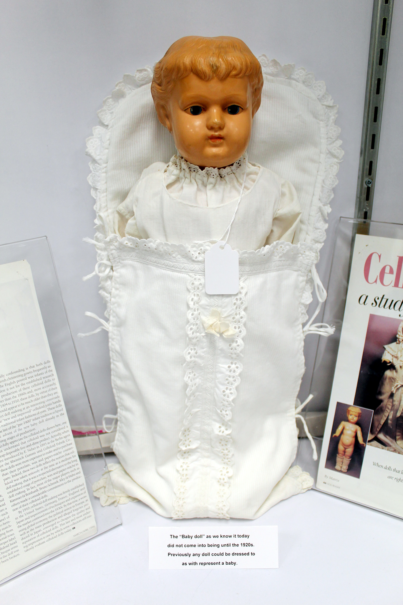 Shirley is the author of a book on celluloid dolls, which is shown in the exhibit, as well as several of the celluloid dolls which are featured in the book.